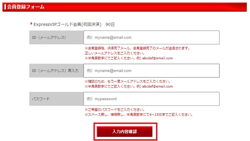 ご自身のメールアドレスと希望のパスワードを入力して、入力内容確認ボタンを押します。